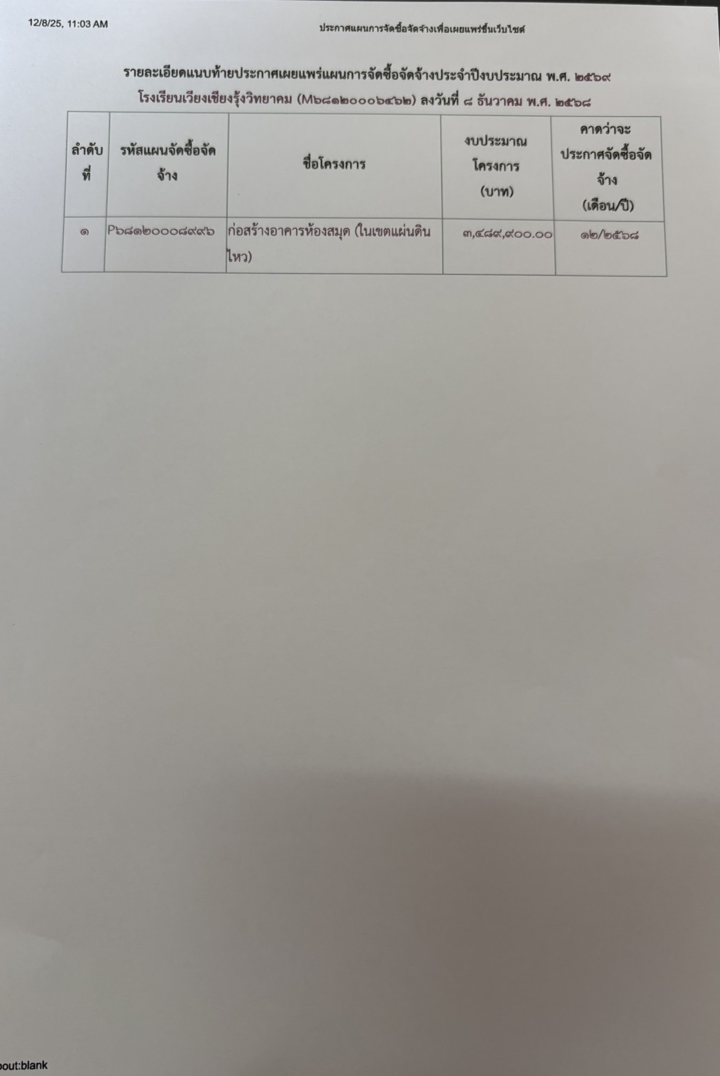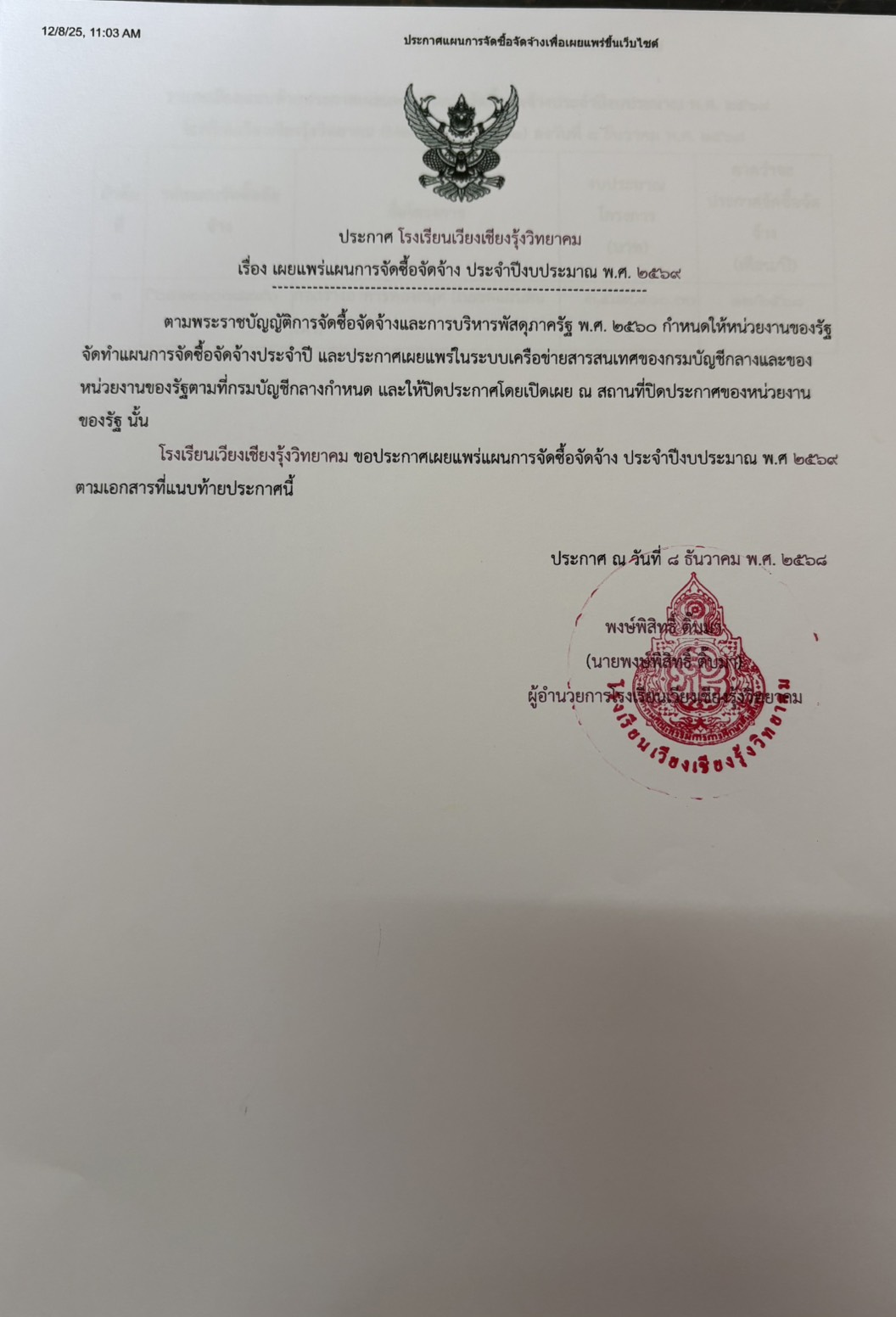 ประกาศโรงเรียนเวียงเชียงรุ้งวิทยาคม เรื่องเผยแพร่แผนการจัดซื้อจัดจ้าง ประจำปีงบประมาณ พ.ศ.2569